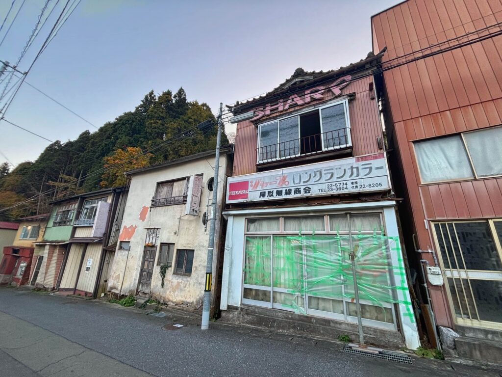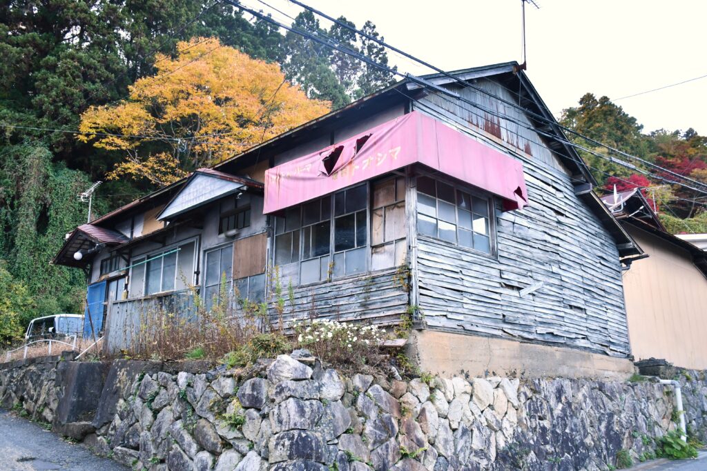 こちらは理容室が入っていた建物のようだが、すでに空き家になっている。鎧張りの剥がれかけた板が、時代の経過を感じさせる。