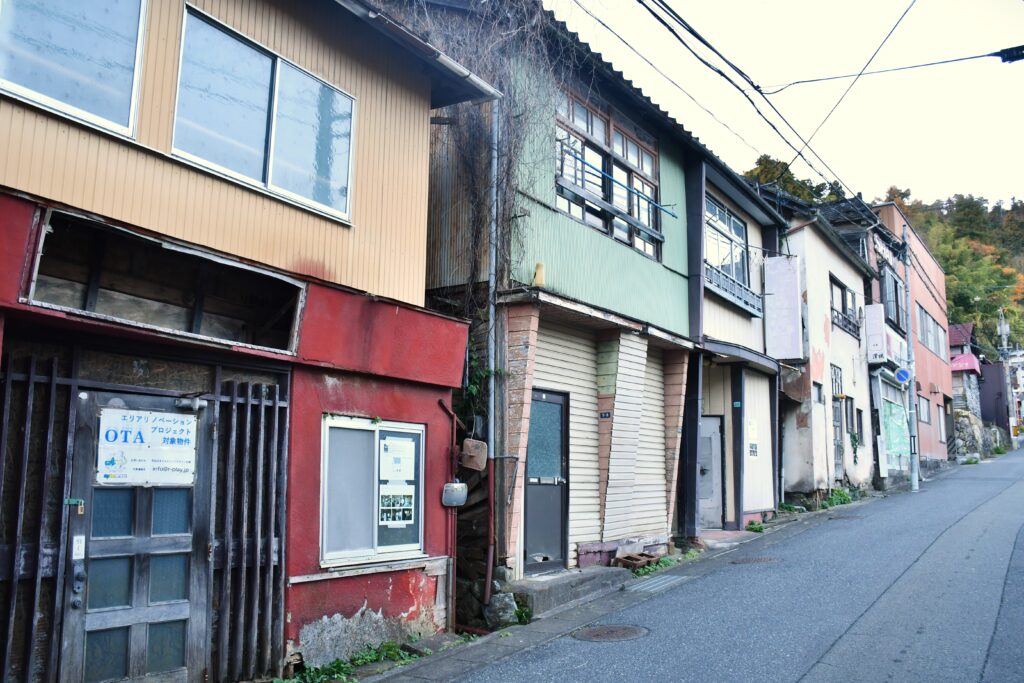 しかし、この地域は、エリアビジョンという行政の地域おこしプロジェクトの重点地域からは外れているようで、2025年末時点ではご覧のように廃墟然としたうら寂しい通りとなっている。(なお、もう少し海のほうまで降りて行くと、アートギャラリーやカフェなどの新しいテナントが入った建物がいくつかあるらしい。)