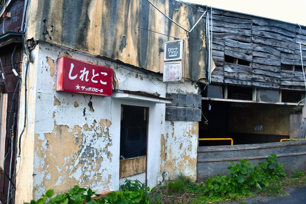 歩いていくと、こちらの「しれとこ」というスナックの看板が目に入ってきた。まぎれもない廃墟だ。ここが目的の廃スナックだろう。