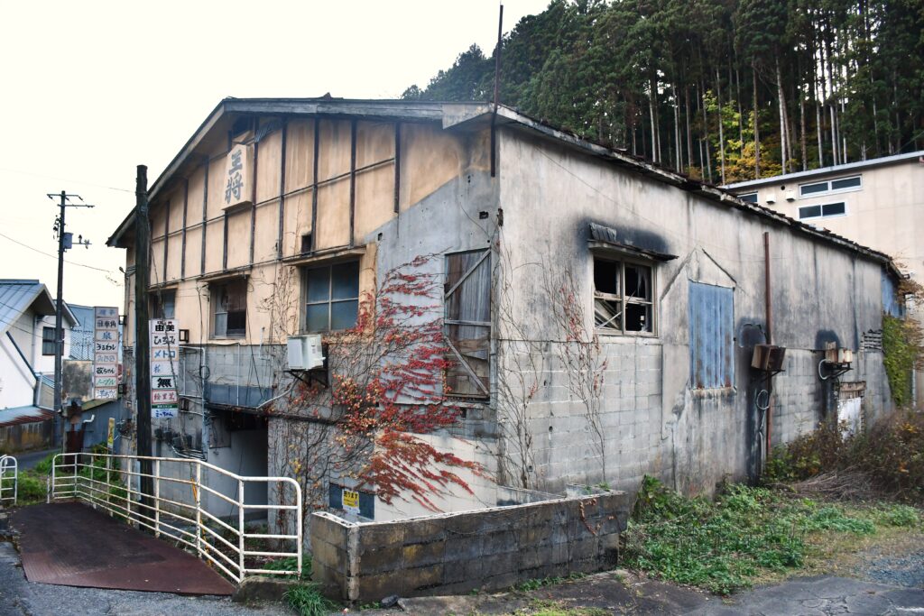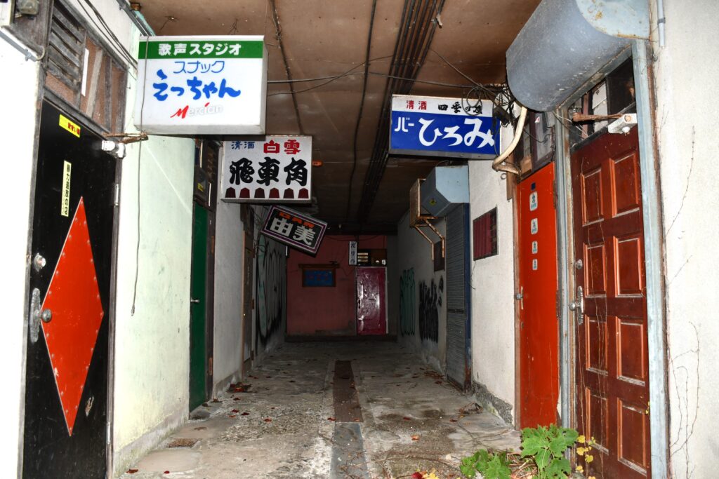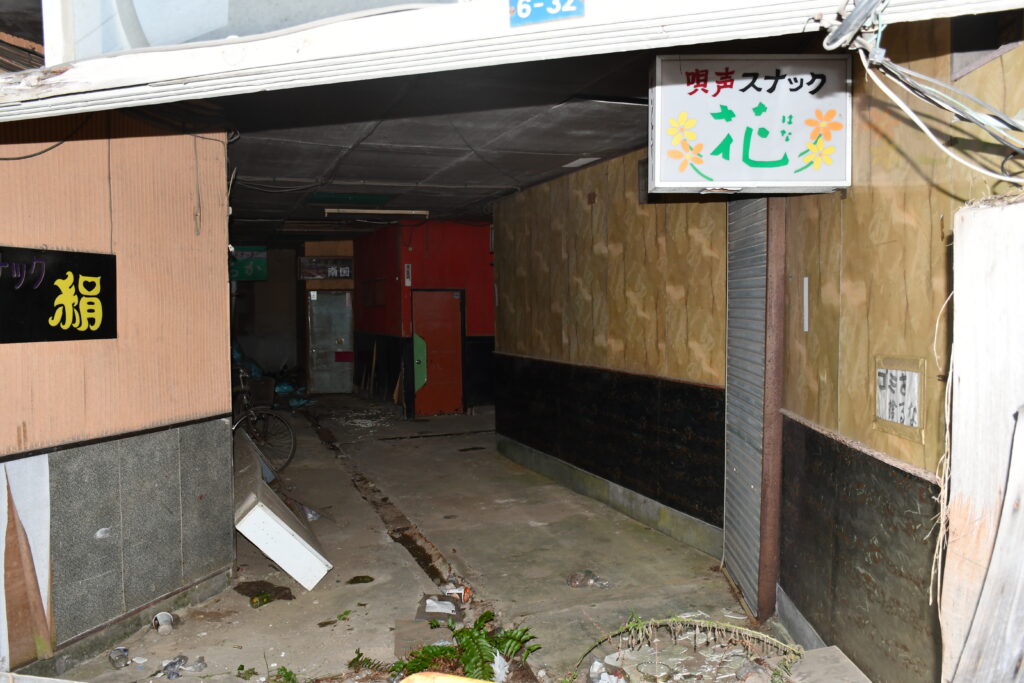 王将飲食街の開業時期は不明だが、2018年ごろにすべてのお店が閉店し、現在のように廃墟化したようである。ネットをみていると、2017年ごろのブログで、一軒だけ(バーひろみ)営業しているお店があったと記載されているものがあった5。少なくとも2017年までは、生きているお店があったということだが、当時もほとんどのお店は閉店し廃墟然とした様子であったことが分かる。