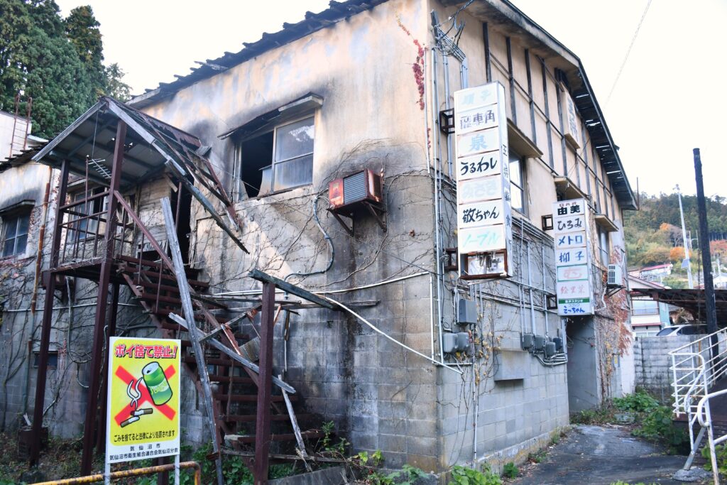気仙沼港のすぐ近くに、スナック店がたくさん集まっていた建物の廃墟が気仙沼にあるらしいという情報をネットで入手し、二つ目の目的地はそちらへと向かった。