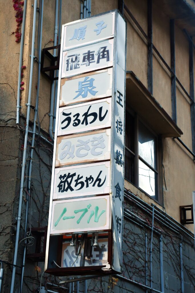 入っていたお店の看板がずらりと並んでいる。このひとつの建物に、少なくとも看板が出ている分だけで15軒入っていたようだから、すごい密集度だ。
